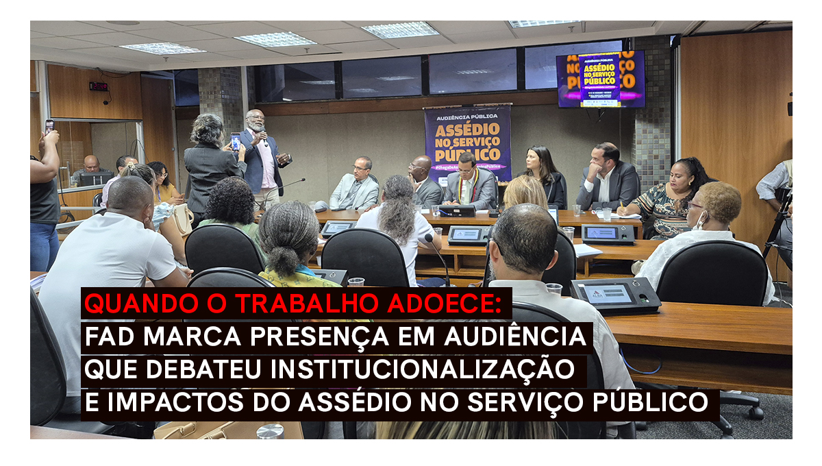 FAD marca presença em audiência que debateu institucionalização e impactos do assédio no serviço público 12/12/2025 Ascom Fórum das ADs Invisível para muitos, devastador para tantos, o assédio no trabalho no serviço público foi objeto de audiência real...