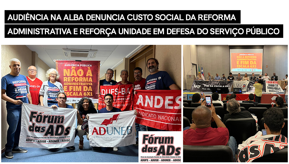 Audiência na ALBA denuncia custo social da reforma administrativa e reforça unidade em defesa do serviço público 12/12/2025 Ascom Fórum das ADs Fórum das ADs reforça a luta contra o desmonte de direitos e pela conquista de uma vida que vá além do trabalho...