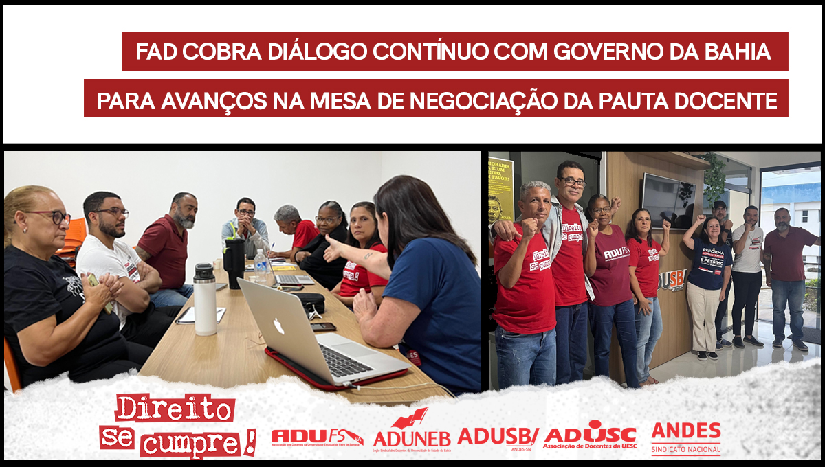 FAD cobra diálogo contínuo com governo da Bahia para avanços na mesa de negociação da pauta docente 12/12/2025 Ascom Fórum das ADs Necessidade de que o governo da Bahia implemente agenda de diálogo contínuo com o movimento docente foi tema de destaque da reuniã...