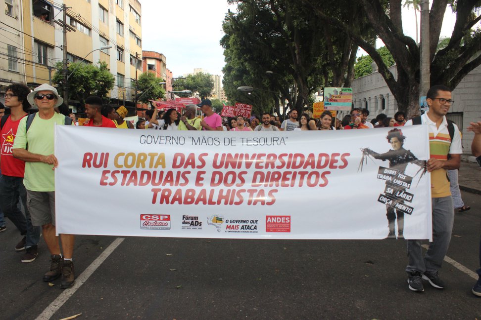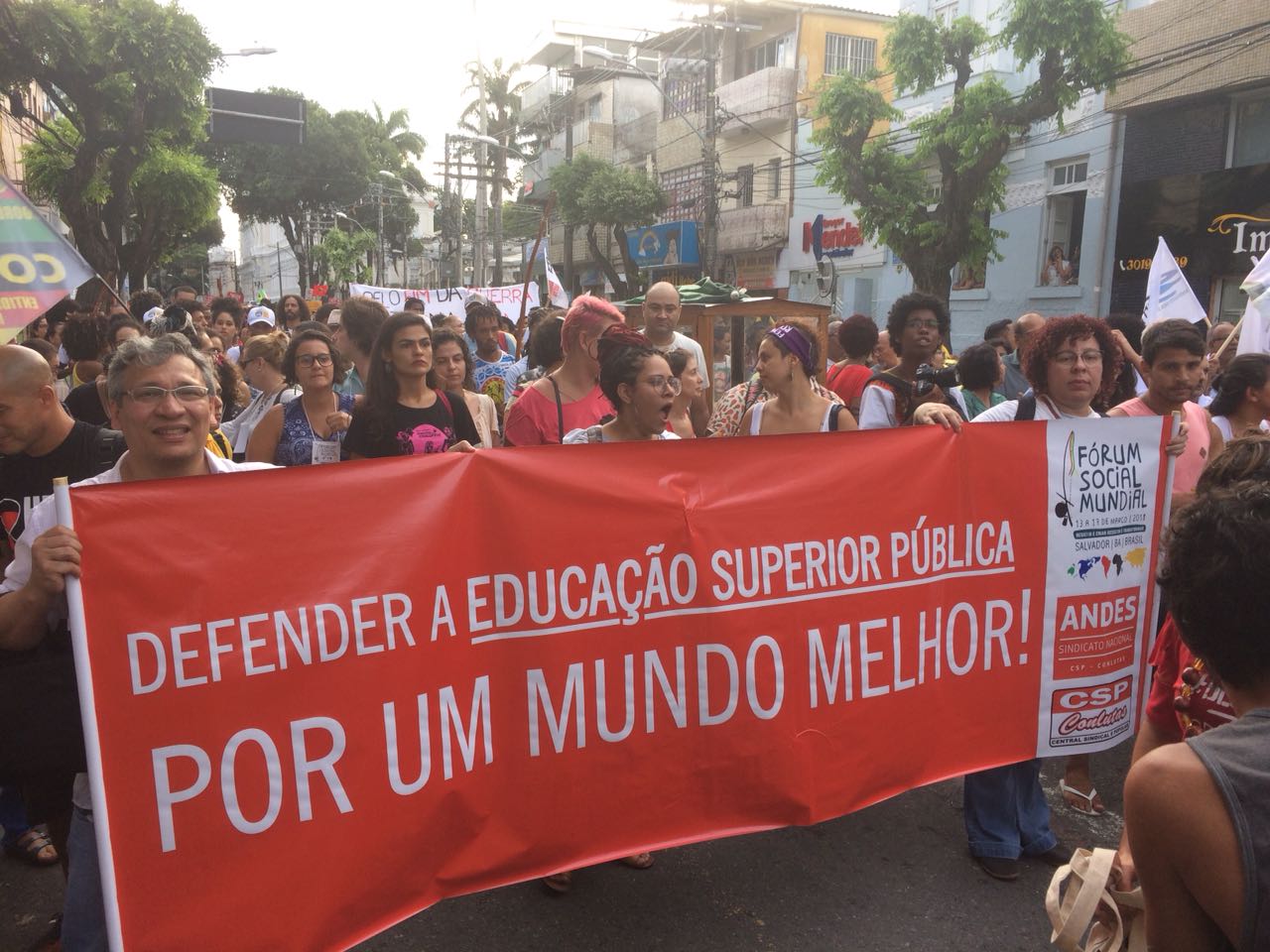 Presente na marcha e nas atividades do FSM, as seções sindicais dos docentes das Universidades Estaduais Baianas, entre elas a ADUNEB, levaram à atividade faixas e panfletos que denunciaram o descaso do governo da Bahia com a educação pública superior. Um dos coordenadores do sindicato, Vamberto Ferreira, comentou sobre as reivindicações do Movimento Docente. “O FSM busca pensar a transformação a sociedade. Nós da ADUNEB participamos desse espaço e defendemos a universidade pública e gratuita, além do respeito aos direitos trabalhistas dos professores e professoras. Atualmente 888 docentes das Ueba têm seus direitos à promoção, progressão e alteração de regime de trabalho negados pelo governo estadual”, afirmou Ferreira. Os professores denunciaram ainda o arrocho salarial a que são submetidos. “Estamos há três anos sem o pagamento da recomposição das perdas da inflação. Já perdemos mais de 20% de nosso salário. É o maior arrocho dos últimos 20 anos para os servidores públicos baianos”, finalizou o dirigente da ADUNEB.