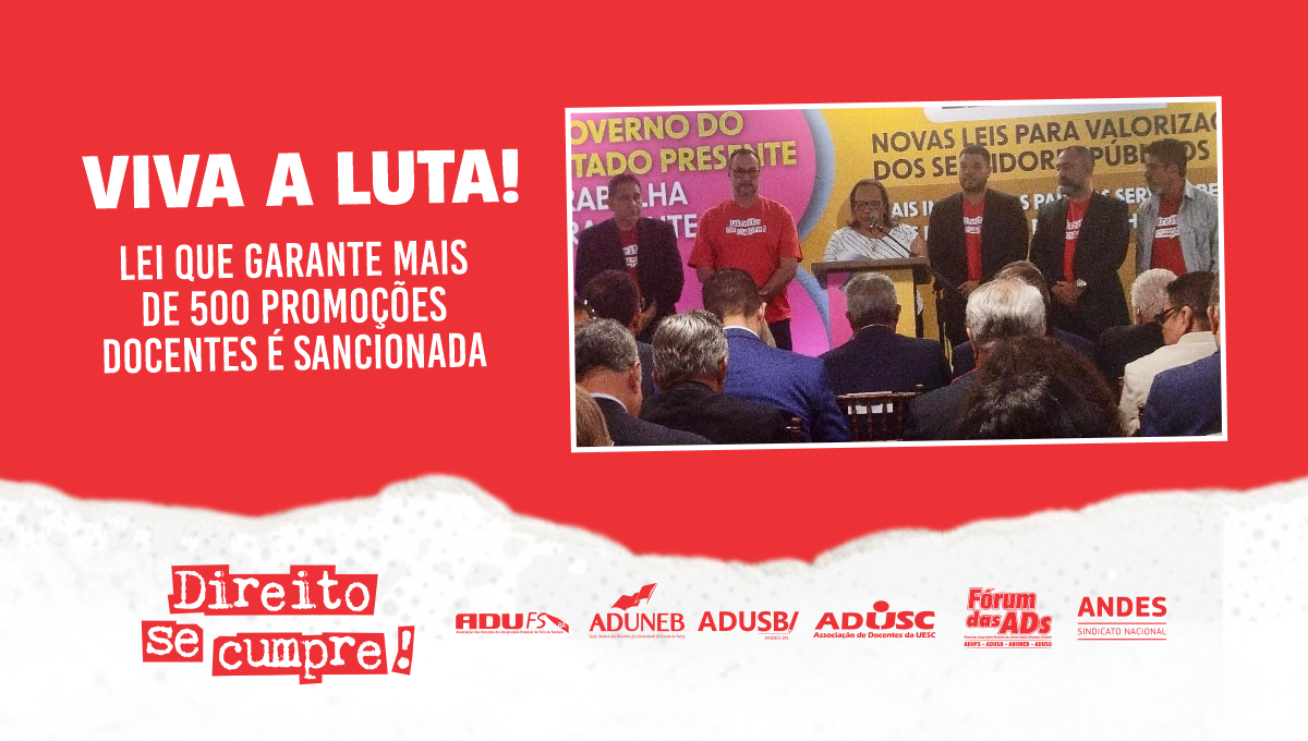 Viva a luta! Lei que garante mais de 500 promoções docentes é sancionada 09/09/2025 FAD O movimento docente das Universidades Estaduais da Bahia conquistou uma grande vitória nesta segunda-feira (08). Em cerimônia realizada n...